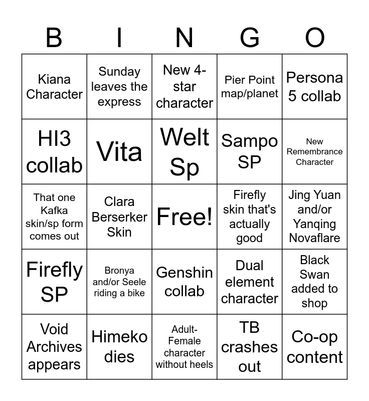 This bingo card has a free space and 24 words: Bronya and/or Seele riding a bike, Himeko dies, Welt Sp, Void Archives appears, Persona 5 collab, Kiana Character, HI3 collab, Sunday leaves the express, Firefly skin that's actually good, Genshin collab, Sampo SP, That one Kafka skin/sp form comes out, Dual element character, Black Swan added to shop, Vita, TB crashes out, Jing Yuan and/or Yanqing Novaflare, New 4-star character, New Remembrance Character, Clara Berserker Skin, Co-op content, Firefly SP, Pier Point map/planet and Adult-Female character without heels.