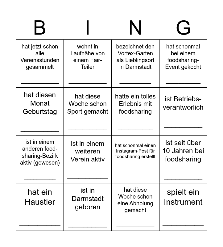 This bingo card has 16 words: ist in Darmstadt geboren __________, ist seit über 10 Jahren bei foodsharing __________, bezeichnet den Vortex-Garten als Lieblingsort in Darmstadt __________, hat jetzt schon alle Vereinsstunden gesammelt ____________, ist in einem anderen food-sharing-Bezirk aktiv (gewesen) __________, wohnt in Laufnähe von einem Fair-Teiler ____________, hat schonmal einen Instagram-Post für foodsharing erstellt ___________, hat diese Woche schon eine Abholung gemacht ____________, hat diesen Monat Geburtstag __________, hat diese Woche schon Sport gemacht ___________, hat ein Haustier _________, hat schonmal bei einem foodsharing-Event gekocht ___________, ist in einem weiteren Verein aktiv ___________, ist Betriebs-verantworlich __________, hatte ein tolles Erlebnis mit foodsharing __________ and spielt ein Instrument _________.