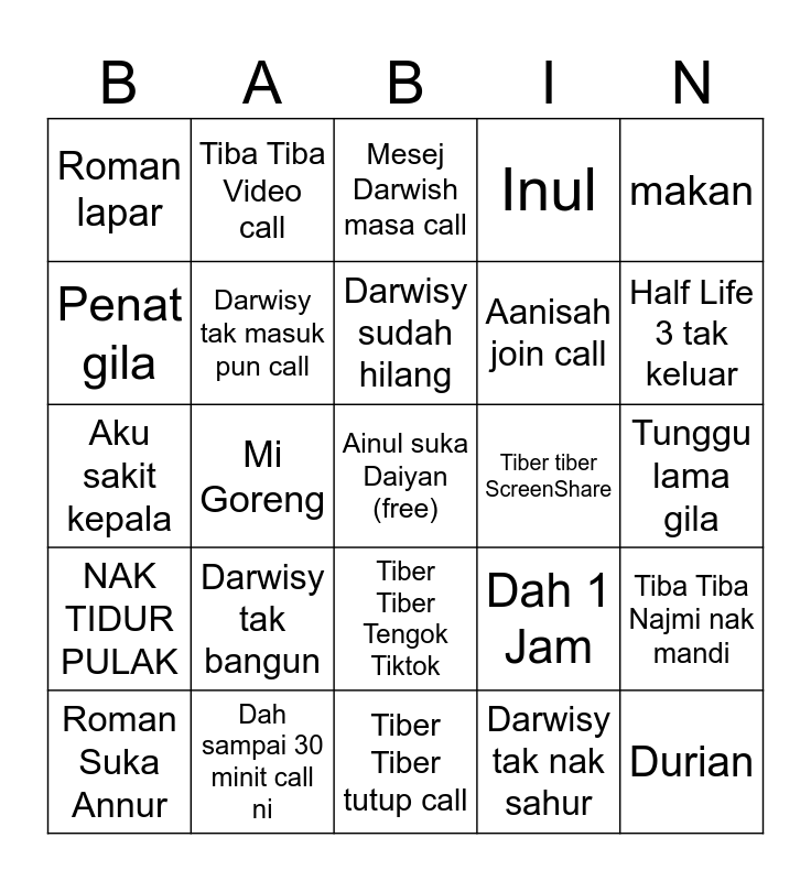 This bingo card has a free space and 24 words: Darwisy tak bangun, Dah sampai 30 minit call ni, Darwisy sudah hilang, Roman Suka Annur, makan, Roman lapar, Penat gila, Tiba Tiba Video call, Tiber tiber ScreenShare, Tiber Tiber Tengok Tiktok, Aanisah join call, Aku sakit kepala, Dah 1 Jam, Tiba Tiba Najmi nak mandi, Darwisy tak masuk pun call, Darwisy tak nak sahur, Tunggu lama gila, Mesej Darwish masa call, Half Life 3 tak keluar, Mi Goreng, Durian, NAK TIDUR PULAK, Inul and Tiber Tiber tutup call.