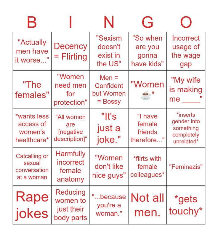 This bingo card has a free space and 24 words: Rape jokes, Harmfully incorrect female anatomy, Men = Confident but Women = Bossy, Not all men., Incorrect usage of the wage gap, "Actually men have it worse...", Decency = Flirting, "Sexism doesn't exist in the US", "I have female friends therefore...", *inserts gender into something completely unrelated*, *wants less access of women's healthcare*, "Women need men for protection", *flirts with female colleagues*, "Feminazis", "The females", Reducing women to just their body parts, "...because you're a woman.", "So when are you gonna have kids", "My wife is making me ____", Catcalling or sexual conversation at a woman, "All women are [negative description]", "Women don't like nice guys", "Women ☕️" and *gets touchy*.