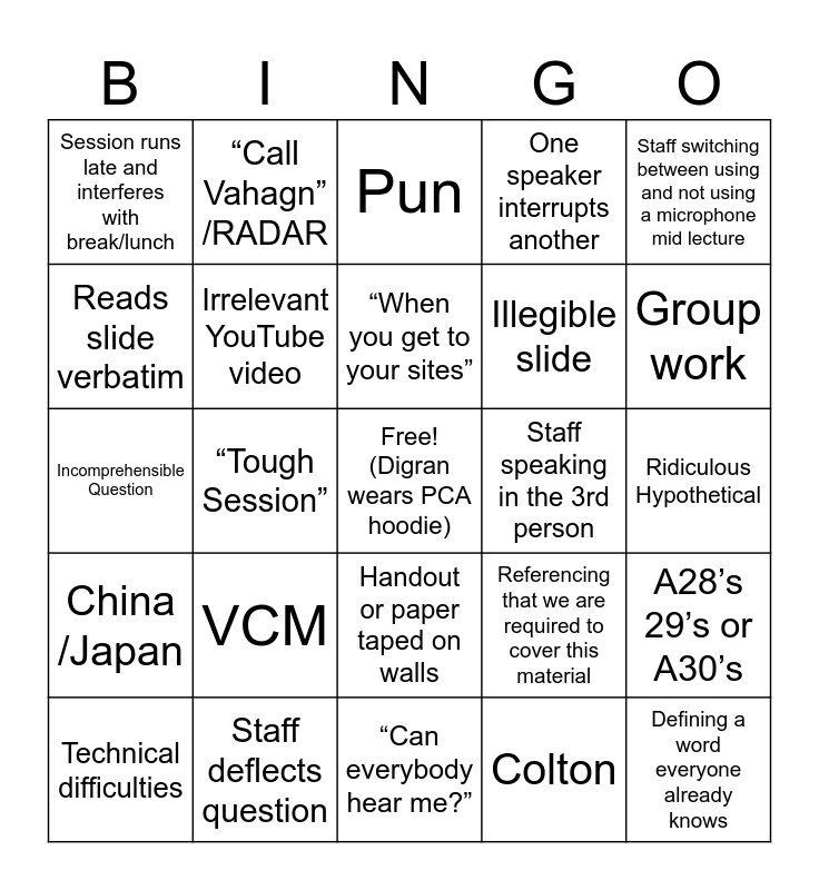 This bingo card has a free space and 24 words: VCM, Staff deflects question, “When you get to your sites”, Technical difficulties, Staff switching between using and not using a microphone mid lecture, Session runs late and interferes with break/lunch, Reads slide verbatim, “Call Vahagn” /RADAR, Staff speaking in the 3rd person, Handout or paper taped on walls, Illegible slide, Incomprehensible Question, Referencing that we are required to cover this material, A28’s 29’s or A30’s, Irrelevant YouTube video, Colton, Ridiculous Hypothetical, Pun, Group work, “Tough Session”, Defining a word everyone already knows, China /Japan, One speaker interrupts another and “Can everybody hear me?”.