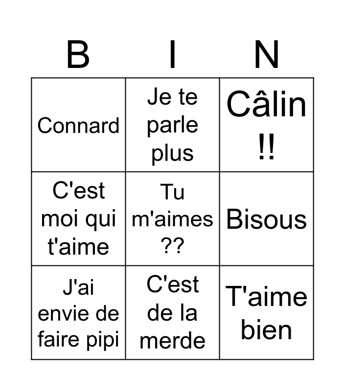 This bingo card has 9 words: J'ai envie de faire pipi, Câlin !!, Je te parle plus, C'est moi qui t'aime, Connard, Bisous, Tu m'aimes ??, T'aime bien and C'est de la merde.