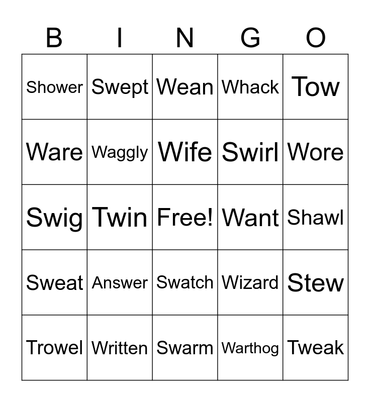 This bingo card has a free space and 129 words: Sweep, Swept, Flower, Pillow, Newt, Whale, Sweat, Wrote, Write, Snowflake, Wear, Swear, Sweet, Wipe, Swipe, Wait, Swarm, Show, Whirl, Twist, Twirl, Swirl, Whimper, Whisper, Wing, Swing, Tweak, Wake, Weak, Warm, Swig, Twin, Win, Twig, Wig, Winter, Whistle, White, Wish, Wet, Want, Went, Wind, Window, Wild, Worry, Worried, Answer, Witch, Wizard, Wiggle, Trowel, Towel, Tower, Wast, West, Waste, Power, Wonder, Wade, Widen, Wide, Narrow, Wot, Wont, Shower, Shown, Swore, Wore, Ware, Whin, Shawl, Whinny, Wolves, Swim, Wim, Wink, Squawk, Swung, Wart, Warthog, Tow, Town, Two, Wife, Wiped, Written, Weep, Wheel, Trawl, Few, Watch, Swatch, Switch, Water, Watermelon, Weather, Wean, Waggly, Waggle, Wick, Whack, Week, Wonderful, Straw, Stew, Seaweed, Throw, Wedding, Whisker, Whisk, Whale, What, Where, Between, Blew, Clew, Flew, Slew, Crew, Brew, Drew, Grew, Jigsaw, Wise, Wolfhound, When, Were and Wendy.