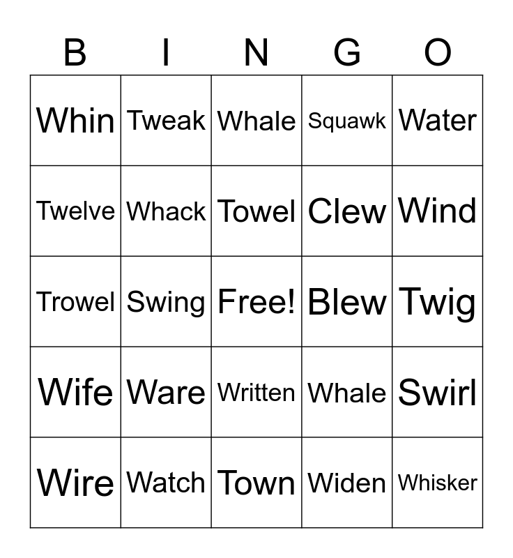 This bingo card has a free space and 139 words: Sweep, Swept, Flower, Pillow, Newt, Whale, Sweat, Wrote, Write, Snowflake, Wear, Swear, Sweet, Wipe, Swipe, Wait, Swarm, Show, Whirl, Twist, Twirl, Swirl, Whimper, Whisper, Wing, Swing, Tweak, Wake, Weak, Warm, Swig, Twin, Win, Twig, Wig, Winter, Whistle, White, Wish, Wet, Want, Went, Wind, Window, Wild, Worry, Worried, Answer, Witch, Wizard, Wiggle, Trowel, Towel, Tower, Wast, West, Waste, Power, Wonder, Wade, Widen, Wide, Narrow, Wot, Wont, Shower, Shown, Swore, Wore, Ware, Whin, Shawl, Whinny, Wolves, Swim, Wim, Wink, Squawk, Swung, Wart, Warthog, Tow, Town, Two, Wife, Wiped, Written, Weep, Wheel, Trawl, Few, Watch, Swatch, Switch, Water, Watermelon, Weather, Wean, Waggly, Waggle, Wick, Whack, Week, Wonderful, Straw, Stew, Seaweed, Throw, Wedding, Whisker, Whisk, Whale, What, Where, Between, Blew, Clew, Flew, Slew, Crew, Brew, Drew, Grew, Jigsaw, Wise, Wolfhound, Weep, Were, Wendy, Whinny, When, Twinkle, Twenty, Twelve, Wire, Wine, Waste, Wasteful and Wash.