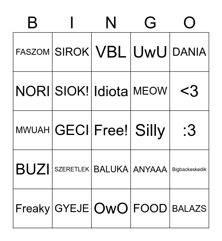 This bingo card has a free space and 24 words: SZERETLEK, GYEJE, Idiota, Freaky, DANIA, FASZOM, NORI, SIROK, Silly, BALUKA, MEOW, MWUAH, ANYAAA, Bigbackeskedik, SIOK!, FOOD, :3, VBL, <3, GECI, BALAZS, BUZI, UwU and OwO.
