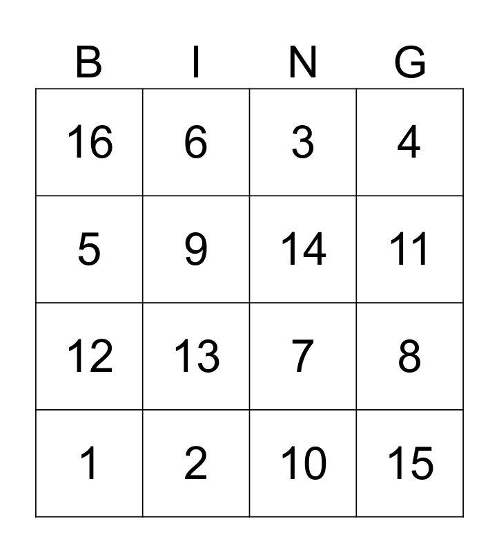 This bingo card has 16 words: 1, 2, 3, 4, 5, 6, 7, 8, 16, 9, 10, 11, 12, 13, 14 and 15.