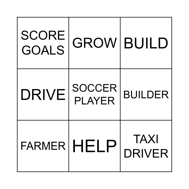 This bingo card has a free space and 8 words: BUILDER, BUILD, GROW, FARMER, SCORE GOALS, TAXI DRIVER, DRIVE and HELP.