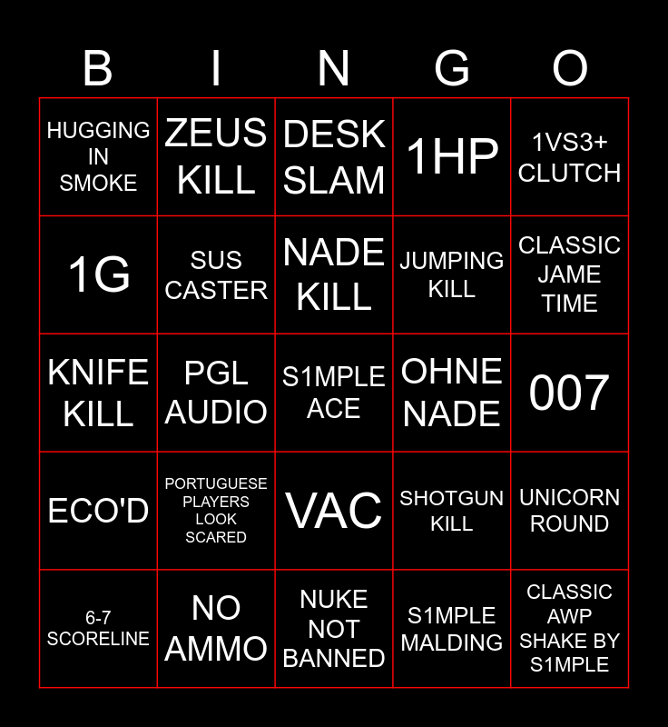 This bingo card has a free space and 24 words: PORTUGUESE PLAYERS LOOK SCARED, NO AMMO, NADE KILL, 6-7 SCORELINE, 1VS3+ CLUTCH, HUGGING IN SMOKE, 1G, ZEUS KILL, OHNE NADE, VAC, JUMPING KILL, KNIFE KILL, SHOTGUN KILL, UNICORN ROUND, SUS CASTER, S1MPLE MALDING, 007, DESK SLAM, CLASSIC JAME TIME, PGL AUDIO, CLASSIC AWP SHAKE BY S1MPLE, ECO'D, 1HP and NUKE NOT BANNED.