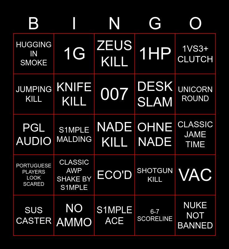 This bingo card has 25 words: PORTUGUESE PLAYERS LOOK SCARED, NO AMMO, NADE KILL, 6-7 SCORELINE, 1VS3+ CLUTCH, HUGGING IN SMOKE, 1G, ZEUS KILL, OHNE NADE, VAC, JUMPING KILL, KNIFE KILL, S1MPLE ACE, SHOTGUN KILL, UNICORN ROUND, SUS CASTER, S1MPLE MALDING, 007, DESK SLAM, CLASSIC JAME TIME, PGL AUDIO, CLASSIC AWP SHAKE BY S1MPLE, ECO'D, 1HP and NUKE NOT BANNED.