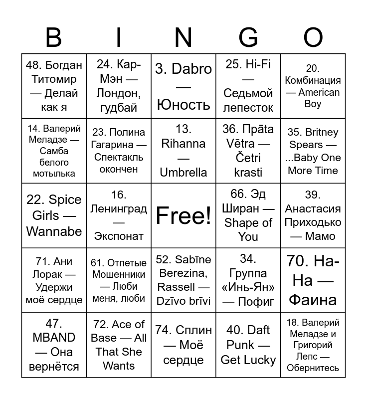 This bingo card has a free space and 75 words: 1. Queen — We Will Rock You, 2. Вера Брежнева — Любовь спасёт мир, 3. Dabro — Юность, 4. Валерий Меладзе — Иностранец, 5. Benny Benassi — Satisfaction, 6. МакSим — Знаешь ли ты, 7. Мираж — Музыка нас связала, 8. Bruno Mars — Uptown Funk, 9. Мумий Тролль — Невеста, 10. ВИА Гра — Попытка №5, 11. Calvin Harris — Summer, 12. Юрий Шатунов — Белые розы, 13. Rihanna — Umbrella, 14. Валерий Меладзе — Самба белого мотылька, 15. Modern Talking — You're My Heart, You're My Soul, 16. Ленинград — Экспонат, 17. Гости из будущего — Лучшее в тебе, 18. Валерий Меладзе и Григорий Лепс — Обернитесь, 19. Lady Gaga — Bad Romance, 20. Комбинация — American Boy, 21. Андрей Губин — Ночь, 22. Spice Girls — Wannabe, 23. Полина Гагарина — Спектакль окончен, 24. Кар-Мэн — Лондон, гудбай, 25. Hi-Fi — Седьмой лепесток, 26. Артур Пирожков — Алкоголичка, 27. The Weeknd — Blinding Lights, 28. Ласковый май — Розовый вечер, 29. Светлана Лобода — Твои глаза, 30. Bon Jovi — It's My Life, 31. Демо — Солнышко, 32. Валерий Меладзе — Сэра, 33. Boney M. — Sunny, 34. Группа «Инь-Ян» — Пофиг, 35. Britney Spears — ...Baby One More Time, 36. Прāta Vētra — Četri krasti, 37. Валерий Меладзе — Текила-любовь, 38. Moloko — Sing It Back, 39. Анастасия Приходько — Мамо, 40. Daft Punk — Get Lucky, 41. Вирус — Ручки, 42. Филипп Киркоров — Цвет настроения синий, 43. Michael Jackson — Billie Jean, 44. ВИА Гра — Бриллианты, 45. Звери — Районы-кварталы, 46. Modjo — Lady (Hear Me Tonight), 47. MBAND — Она вернётся, 48. Богдан Титомир — Делай как я, 49. Dua Lipa — Levitating, 50. Иванушки International — Тополиный пух, 51. Eiffel 65 — Blue (Da Ba Dee), 52. Sabīne Berezina, Rassell — Dzīvo brīvi, 53. Диана Гурцкая — Ты здесь, 54. Backstreet Boys — Everybody (Backstreet's Back), 55. Madonna — Hung Up, 56. Валерий Меладзе — Салют, Вера, 57. Shakira — Whenever, Wherever, 58. Шура — Твори добро, 59. Black Eyed Peas — I Gotta Feeling, 60. Dr. Alban — It's My Life, 61. Отпетые Мошенники — Люби меня, люби, 62. Bermudu Divstūris — Flamingo, 63. ABBA — Dancing Queen, 64. Глюк’oZa — Невеста, 65. Краски — Он не знает ничего, 66. Эд Ширан — Shape of You, 67. Технология — Нажми на кнопку, 68. Верка Сердючка — Дольче Габбана, 69. Pharrell Williams — Happy, 70. На-На — Фаина, 71. Ани Лорак — Удержи моё сердце, 72. Ace of Base — All That She Wants, 73. Дискотека Авария — Новогодняя, 74. Сплин — Моё сердце and 75. Justin Timberlake — Can't Stop the Feeling!.