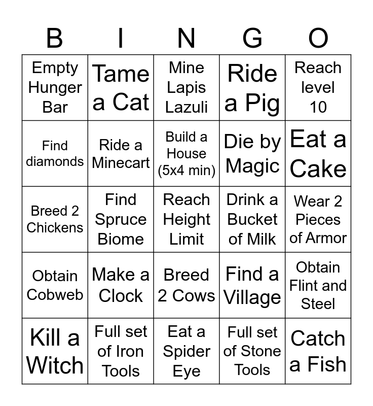This bingo card has a free space and 24 words: Make a Clock, Full set of Iron Tools, Build a House (5x4 min), Kill a Witch, Reach level 10, Empty Hunger Bar, Find diamonds, Tame a Cat, Drink a Bucket of Milk, Breed 2 Cows, Die by Magic, Breed 2 Chickens, Find a Village, Obtain Flint and Steel, Ride a Minecart, Full set of Stone Tools, Wear 2 Pieces of Armor, Mine Lapis Lazuli, Eat a Cake, Find Spruce Biome, Catch a Fish, Obtain Cobweb, Ride a Pig and Eat a Spider Eye.