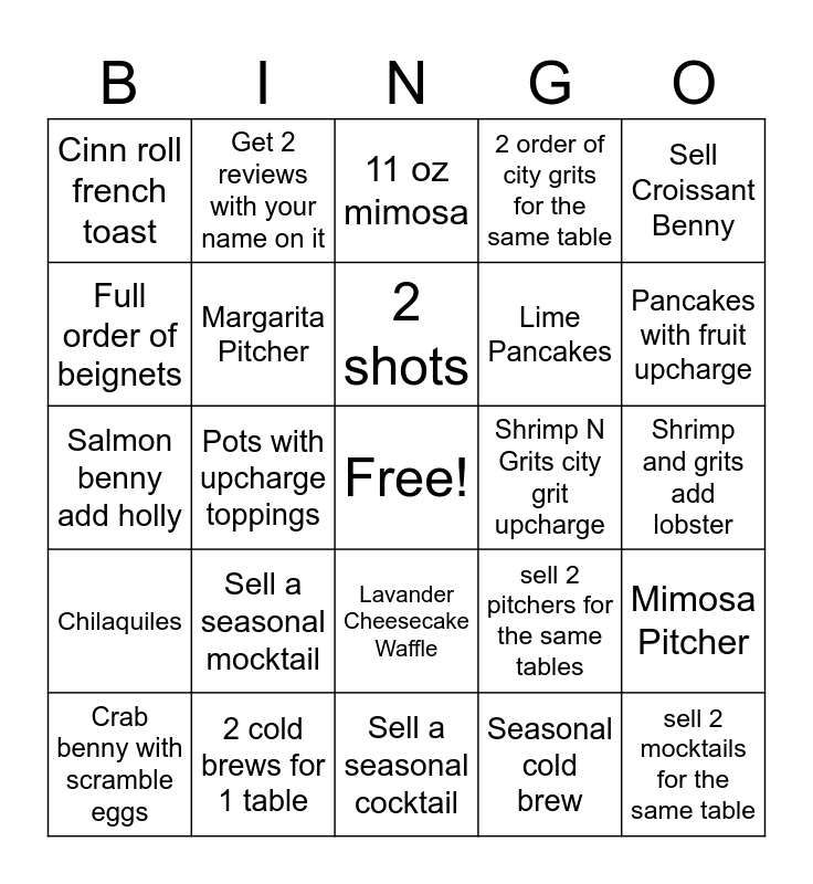 This bingo card has a free space and 24 words: Sell a seasonal mocktail, 2 cold brews for 1 table, 2 shots, Crab benny with scramble eggs, Sell Croissant Benny, Cinn roll french toast, Full order of beignets, Get 2 reviews with your name on it, Shrimp N Grits city grit upcharge, Lavander Cheesecake Waffle, Lime Pancakes, Salmon benny add holly, sell 2 pitchers for the same tables, Mimosa Pitcher, Margarita Pitcher, Seasonal cold brew, Shrimp and grits add lobster, 11 oz mimosa, Pancakes with fruit upcharge, Pots with upcharge toppings, sell 2 mocktails for the same table, Chilaquiles, 2 order of city grits for the same table and Sell a seasonal cocktail.