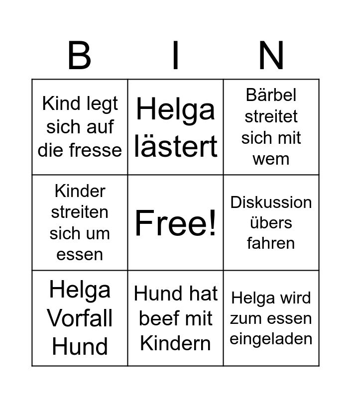 This bingo card has a free space and 8 words: Kinder streiten sich um essen, Helga lästert, Diskussion übers fahren, Helga Vorfall Hund, Bärbel streitet sich mit wem, Kind legt sich auf die fresse, Hund hat beef mit Kindern and Helga wird zum essen eingeladen.