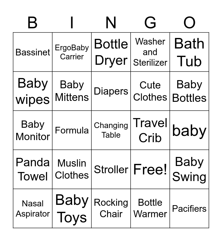 This bingo card has 25 words: Muslin Clothes, Rocking Chair, Diapers, Nasal Aspirator, Bath Tub, Bassinet, Baby wipes, ErgoBaby Carrier, Travel Crib, Stroller, Cute Clothes, Baby Monitor, Free!, Baby Swing, Baby Mittens, Pacifiers, baby, Bottle Dryer, Baby Bottles, Formula, Changing Table, Baby Toys, Panda Towel, Washer and Sterilizer and Bottle Warmer.