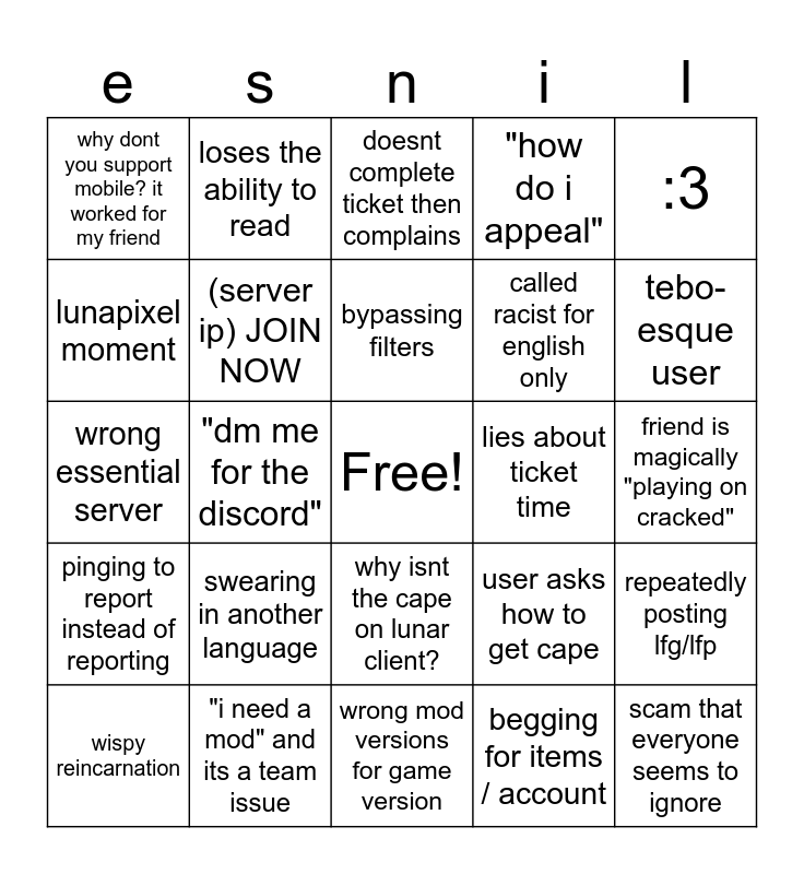 This bingo card has a free space and 27 words: user asks how to get cape, cracked? why no cracked?, called racist for english only, wrong mod versions for game version, lunapixel moment, doesnt complete ticket then complains, loses the ability to read, pinging to report instead of reporting, lies about ticket time, repeatedly posting lfg/lfp, wrong essential server, "how do i appeal", wispy reincarnation, "i need a mod" and its a team issue, tebo-esque user, "i joined and didnt get my cape" like we can tell they joined, (server ip) JOIN NOW, bypassing filters, swearing in another language, why dont you support mobile? it worked for my friend, friend is magically "playing on cracked", begging for items / account, "dm me for the discord", scam that everyone seems to ignore, why isnt the cape on lunar client?, :3 and "i have no friends......" but 50 people wanted to play with them.