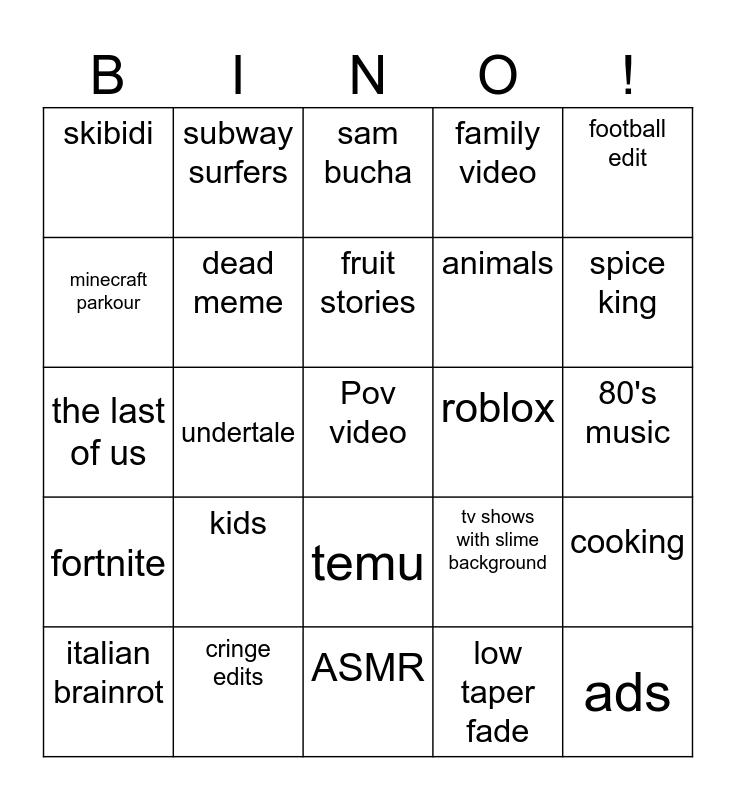 This bingo card has a free space and 24 words: kids, cringe edits, fruit stories, italian brainrot, football edit, skibidi, minecraft parkour, subway surfers, roblox, temu, animals, the last of us, tv shows with slime background, cooking, dead meme, low taper fade, 80's music, sam bucha, spice king, undertale, ads, fortnite, family video and ASMR.
