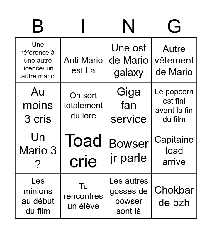 This bingo card has 16 words: Tu rencontres un élève, Capitaine toad arrive, Une ost de Mario galaxy, Une référence à une autre licence/ un autre mario, Un Mario 3 ?, Anti Mario est La, Bowser jr parle, Les autres gosses de bowser sont là, Au moins 3 cris, On sort totalement du lore, Les minions au début du film, Autre vêtement de Mario, Toad crie, Le popcorn est fini avant la fin du film, Giga fan service and Chokbar de bzh.