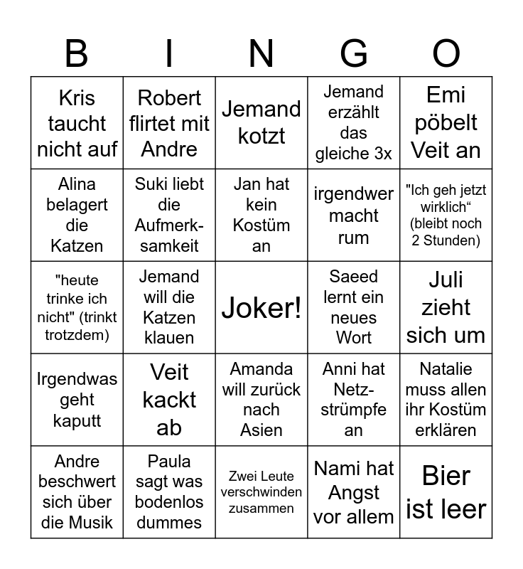 This bingo card has a free space and 24 words: Veit kackt ab, Paula sagt was bodenlos dummes, Jan hat kein Kostüm an, Andre beschwert sich über die Musik, Emi pöbelt Veit an, Kris taucht nicht auf, Alina belagert die Katzen, Robert flirtet mit Andre, Saeed lernt ein neues Wort, Amanda will zurück nach Asien, irgendwer macht rum, "heute trinke ich nicht" (trinkt trotzdem), Anni hat Netz-strümpfe an, Natalie muss allen ihr Kostüm erklären, Suki liebt die Aufmerk-samkeit, Nami hat Angst vor allem, Juli zieht sich um, Jemand kotzt, "Ich geh jetzt wirklich“ (bleibt noch 2 Stunden), Jemand will die Katzen klauen, Bier ist leer, Irgendwas geht kaputt, Jemand erzählt das gleiche 3x and Zwei Leute verschwinden zusammen.