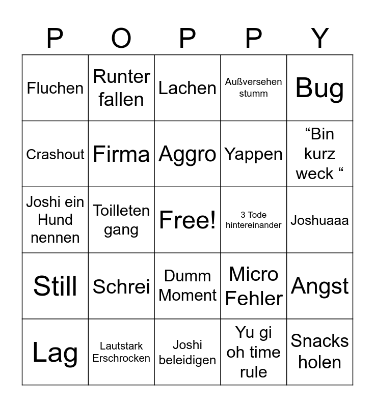 This bingo card has a free space and 24 words: Schrei, Lautstark Erschrocken, Aggro, Lag, Bug, Fluchen, Crashout, Runter fallen, 3 Tode hintereinander, Dumm Moment, Yappen, Joshi ein Hund nennen, Micro Fehler, Angst, Firma, Yu gi oh time rule, Joshuaaa, Lachen, “Bin kurz weck “, Toilleten gang, Snacks holen, Still, Außversehen stumm and Joshi beleidigen.