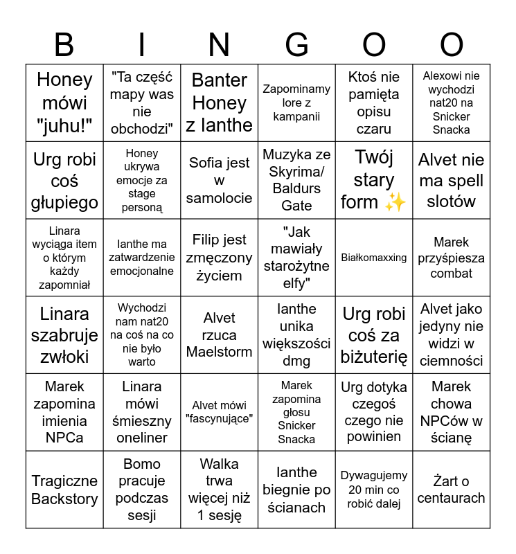 This bingo card has 36 words: Marek zapomina głosu Snicker Snacka, Alvet mówi "fascynujące", Ianthe biegnie po ścianach, Urg robi coś głupiego, Linara szabruje zwłoki, "Jak mawiały starożytne elfy", Honey ukrywa emocje za stage personą, Walka trwa więcej niż 1 sesję, Ktoś nie pamięta opisu czaru, Urg dotyka czegoś czego nie powinien, Alvet nie ma spell slotów, Zapominamy lore z kampanii, Marek chowa NPCów w ścianę, Ianthe ma zatwardzenie emocjonalne, Muzyka ze Skyrima/ Baldurs Gate, Honey mówi "juhu!", Marek zapomina imienia NPCa, Białkomaxxing, Linara wyciąga item o którym każdy zapomniał, Banter Honey z Ianthe, Filip jest zmęczony życiem, Wychodzi nam nat20 na coś na co nie było warto, Ianthe unika większości dmg, Alvet rzuca Maelstorm, Urg robi coś za biżuterię, "Ta część mapy was nie obchodzi", Twój stary form ✨, Bomo pracuje podczas sesji, Sofia jest w samolocie, Alexowi nie wychodzi nat20 na Snicker Snacka, Żart o centaurach, Tragiczne Backstory, Alvet jako jedyny nie widzi w ciemności, Marek przyśpiesza combat, Linara mówi śmieszny oneliner and Dywagujemy 20 min co robić dalej.