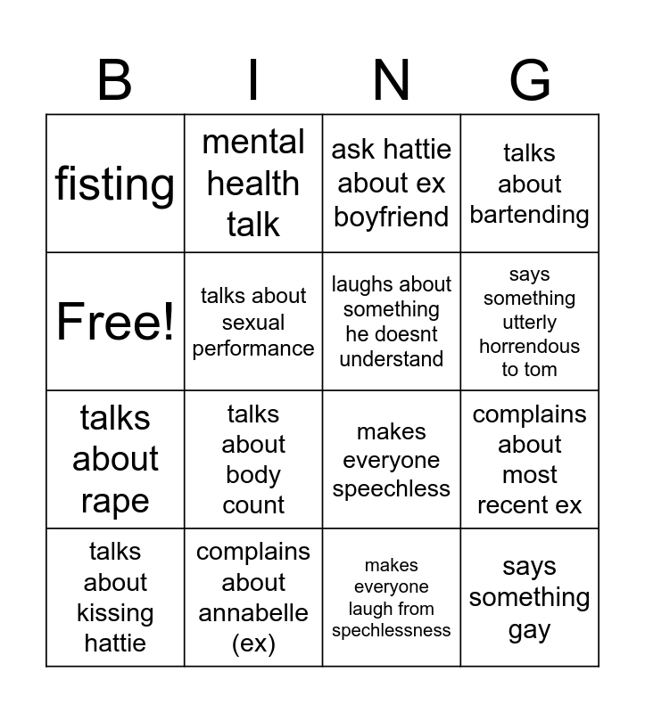 This bingo card has 16 words: complains about annabelle (ex), complains about most recent ex, ask hattie about ex boyfriend, fisting, talks about rape, mental health talk, makes everyone speechless, makes everyone laugh from spechlessness, Free!, talks about sexual performance, talks about kissing hattie, talks about bartending, talks about body count, says something utterly horrendous to tom, laughs about something he doesnt understand and says something gay.