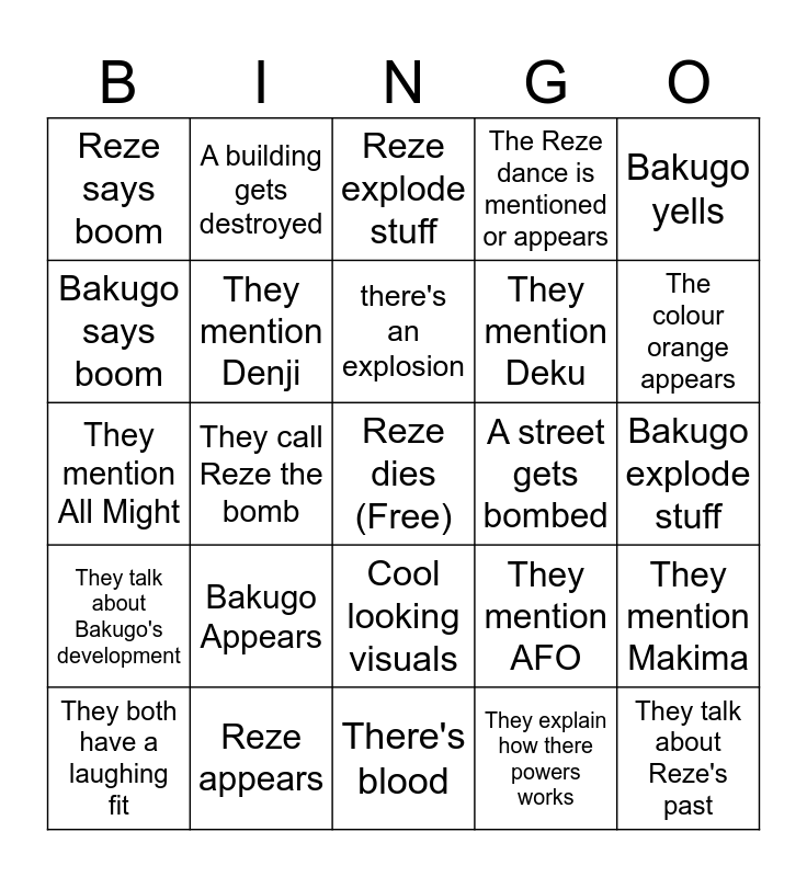 This bingo card has a free space and 24 words: Bakugo Appears, Reze appears, there's an explosion, They both have a laughing fit, Bakugo yells, Reze says boom, Bakugo says boom, A building gets destroyed, A street gets bombed, Cool looking visuals, They mention Deku, They mention All Might, They mention AFO, They mention Makima, They mention Denji, They explain how there powers works, Bakugo explode stuff, Reze explode stuff, The colour orange appears, They call Reze the bomb, They talk about Reze's past, They talk about Bakugo's development, The Reze dance is mentioned or appears and There's blood.