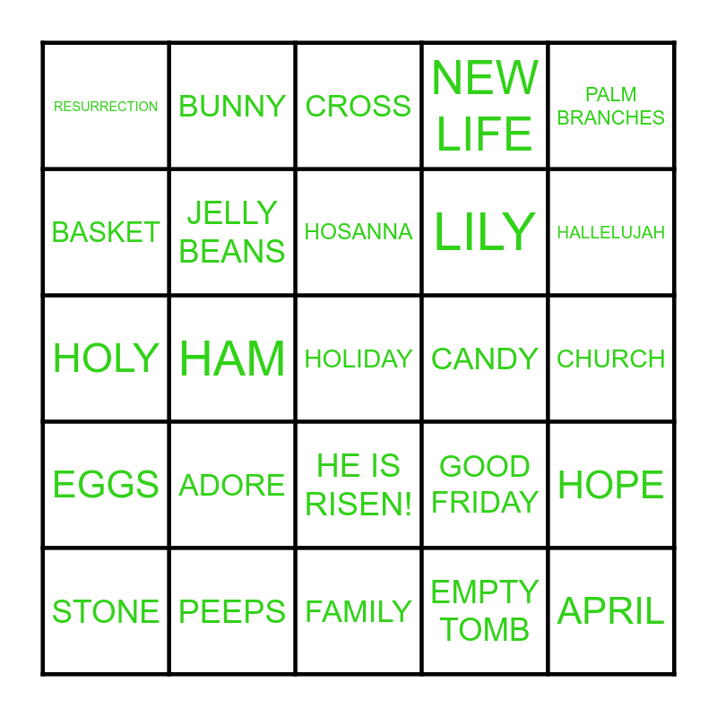 This bingo card has 30 words: PEEPS, BONNETS, HAM, JESUS, RESURRECTION, CROSS, JELLY BEANS, HE IS RISEN!, CANDY, FAMILY, CHURCH, HOLIDAY, EMPTY TOMB, APRIL, HALLELUJAH, FLOWERS, GOOD FRIDAY, EGGS, ADORE, PALM BRANCHES, HOLY, EGG HUNT, BUNNY, LILY, BASKET, NEW LIFE, HOPE, STONE, HOSANNA and HEAVEN.