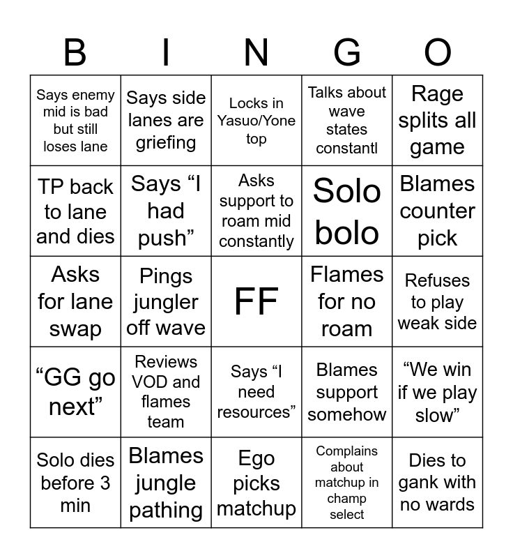 This bingo card has a free space and 29 words: Solo dies before 3 min, Spam missing ping, Pings jungler off wave, Complains about roam timer not matched, Says enemy mid is bad but still loses lane, Locks in Yasuo/Yone top, Says “I had push”, Reviews VOD and flames team, Flames for no roam, Blames jungle pathing, Refuses to play weak side, Dies to gank with no wards, Ego picks matchup, Complains about matchup in champ select, Blames counter pick, Talks about CS numbers a lot, Says “I need resources”, “GG go next”, Rage splits all game, Asks for lane swap, Blames support somehow, “unplayable”, Solo bolo, TP back to lane and dies, Talks about wave states constantl, Says side lanes are griefing, “We win if we play slow”, Asks support to roam mid constantly and Types in all chat during scrim.