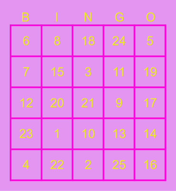 This bingo card has 25 words: 1, 2, 3, 4, 5, 6, 7, 8, 9, 10, 11, 12, 13, 14, 15, 16, 17, 18, 19, 20, 21, 22, 23, 24 and 25.