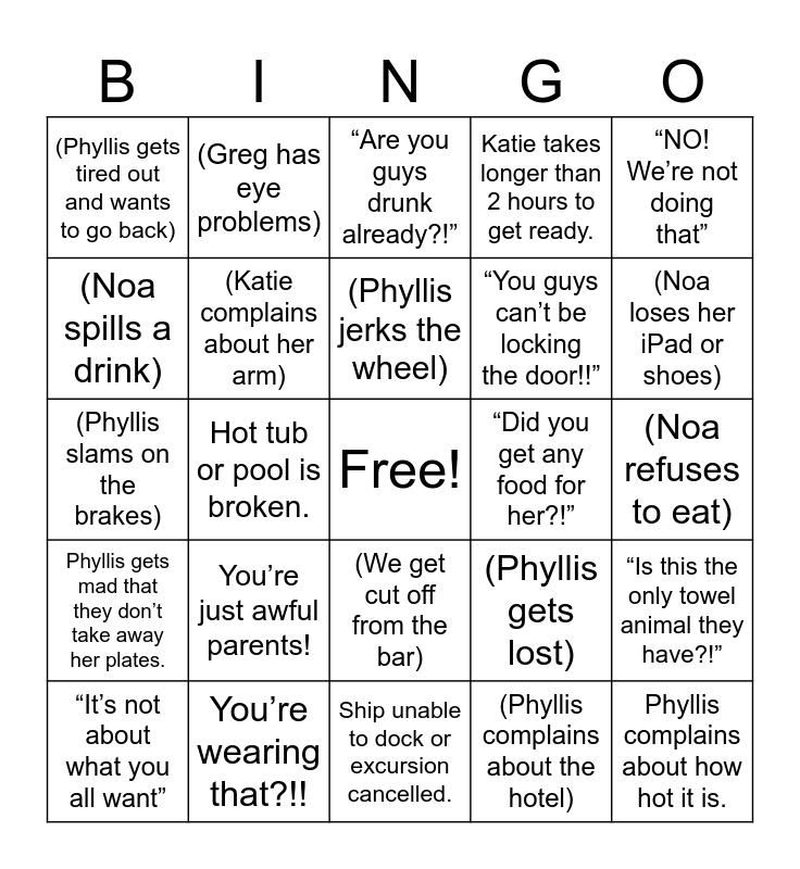 This bingo card has a free space and 24 words: You’re just awful parents!, You’re wearing that?!!, (Phyllis jerks the wheel), “It’s not about what you all want”, “NO! We’re not doing that”, (Phyllis gets tired out and wants to go back), (Noa spills a drink), (Greg has eye problems), “Did you get any food for her?!”, (We get cut off from the bar), “You guys can’t be locking the door!!”, (Phyllis slams on the brakes), (Phyllis gets lost), “Is this the only towel animal they have?!”, (Katie complains about her arm), (Phyllis complains about the hotel), (Noa refuses to eat), “Are you guys drunk already?!”, (Noa loses her iPad or shoes), Hot tub or pool is broken., Phyllis complains about how hot it is., Phyllis gets mad that they don’t take away her plates., Katie takes longer than 2 hours to get ready. and Ship unable to dock or excursion cancelled..