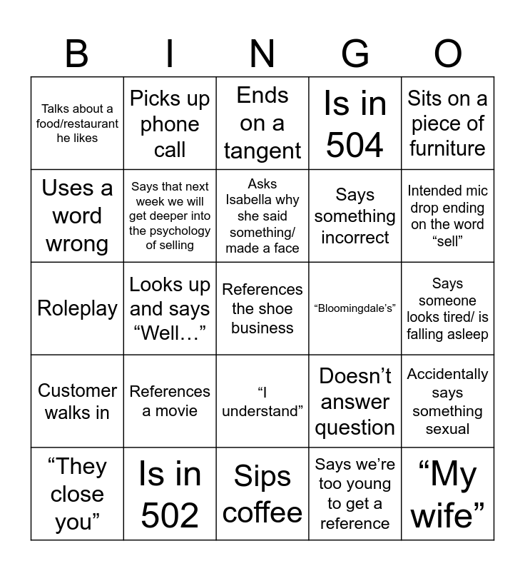 This bingo card has a free space and 24 words: References a movie, Is in 502, Asks Isabella why she said something/ made a face, “They close you”, Sits on a piece of furniture, Talks about a food/restaurant he likes, Uses a word wrong, Picks up phone call, “Bloomingdale’s”, “I understand”, Says something incorrect, Roleplay, Doesn’t answer question, Accidentally says something sexual, Says that next week we will get deeper into the psychology of selling, Says we’re too young to get a reference, Says someone looks tired/ is falling asleep, Ends on a tangent, Intended mic drop ending on the word “sell”, Looks up and says “Well…”, “My wife”, Customer walks in, Is in 504 and Sips coffee.