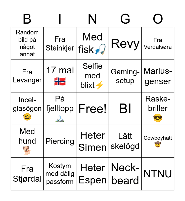This bingo card has a free space and 24 words: Piercing, Kostym med dålig passform, Selfie med blixt⚡️, Fra Stjørdal, Fra Verdalsøra, Random bild på något annat, Fra Levanger, Fra Steinkjer, BI, Heter Simen, Gaming-setup, Incel-glasögon 🤓, Lätt skelögd, Cowboyhatt🤠, 17 mai 🇳🇴, Neck-beard, Raske-briller😎, Med fisk🎣, Marius-genser, På fjelltopp🏔️, NTNU, Med hund🐕, Revy and Heter Espen.