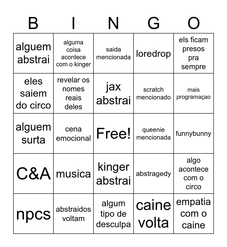 This bingo card has a free space and 26 words: kinger abstrai, caine volta, jax abstrai, abstraidos voltam, els ficam presos pra sempre, alguem abstrai, eles saiem do circo, alguma coisa acontece com o kinger, funnybunny, abstragedy, scratch mencionado, alguem surta, algo acontece com o circo, npcs, cena emocional, ribbit mencionada, loredrop, C&A, saida mencionada, empatia com o caine, mais programaçao, algum tipo de desculpa, queenie mencionada, musica, revelar os nomes reais deles and IHNMAIMS referenciado.