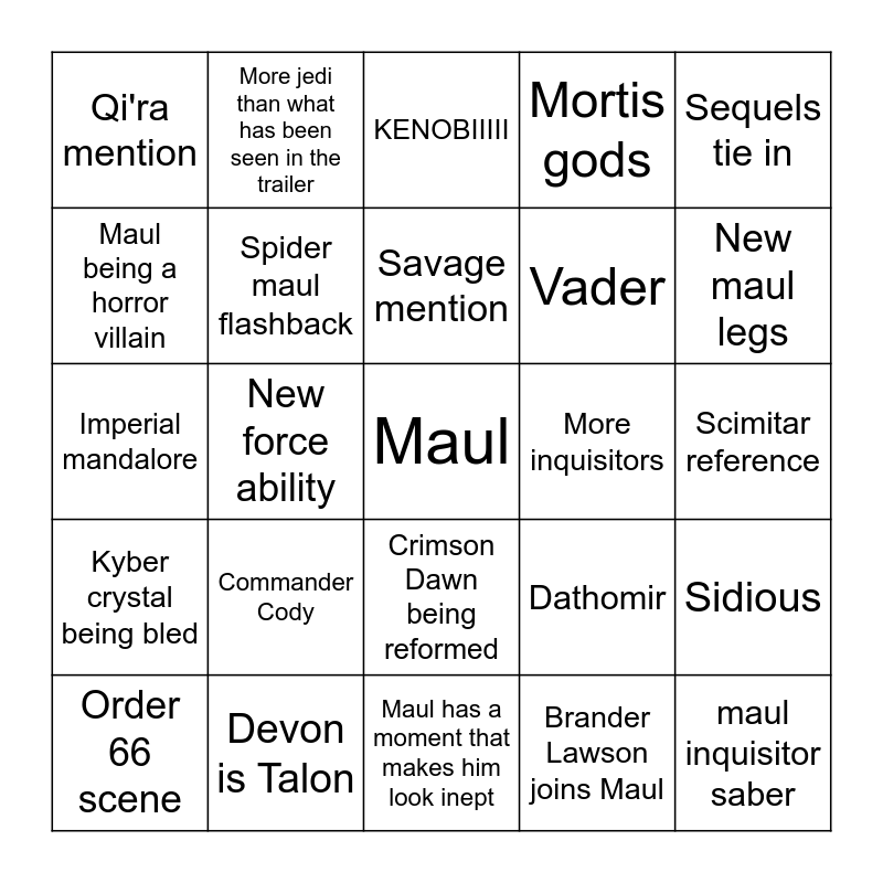 This bingo card has a free space and 24 words: Commander Cody, Devon is Talon, Savage mention, Order 66 scene, Sequels tie in, Qi'ra mention, Maul being a horror villain, More jedi than what has been seen in the trailer, More inquisitors, Crimson Dawn being reformed, Vader, Imperial mandalore, Dathomir, Sidious, Spider maul flashback, Brander Lawson joins Maul, Scimitar reference, KENOBIIIII, New maul legs, New force ability, maul inquisitor saber, Kyber crystal being bled, Mortis gods and Maul has a moment that makes him look inept.