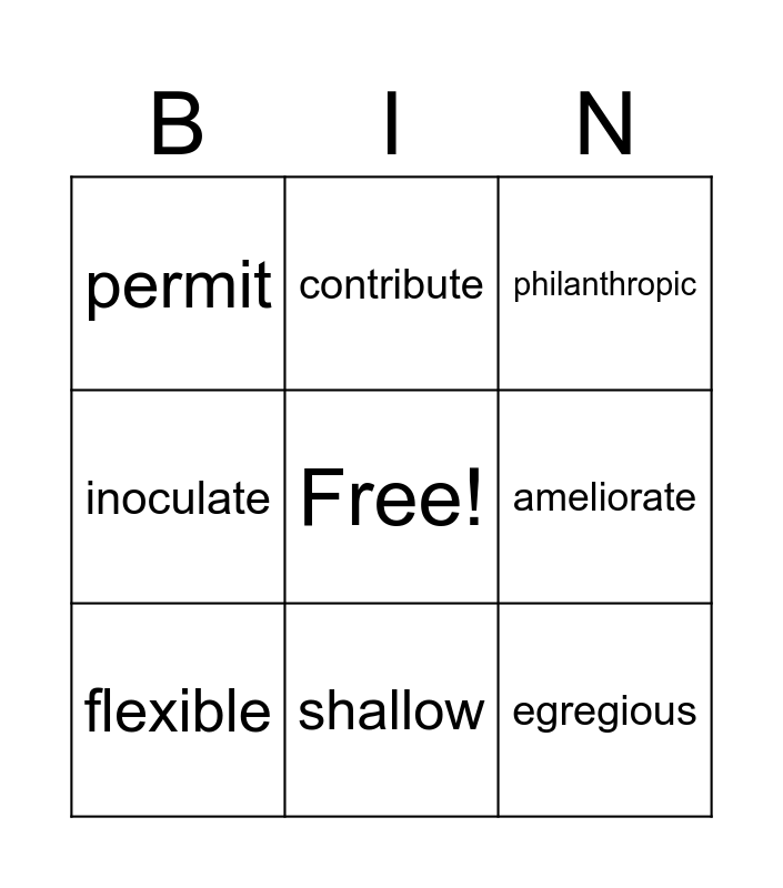 This bingo card has a free space and 8 words: ameliorate, philanthropic, contribute, flexible, permit, egregious, inoculate and shallow.