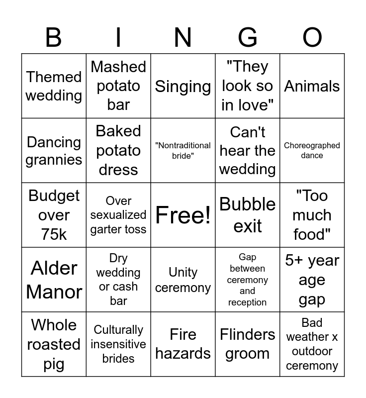 This bingo card has a free space and 24 words: Dry wedding or cash bar, Culturally insensitive brides, "Nontraditional bride", Whole roasted pig, Animals, Themed wedding, Dancing grannies, Mashed potato bar, Bubble exit, Unity ceremony, Can't hear the wedding, Budget over 75k, Gap between ceremony and reception, 5+ year age gap, Baked potato dress, Flinders groom, "Too much food", Singing, Choreographed dance, Over sexualized garter toss, Bad weather x outdoor ceremony, Alder Manor, "They look so in love" and Fire hazards.