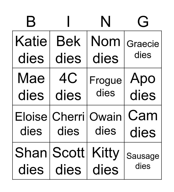 This bingo card has 16 words: Scott dies, Cam dies, Nom dies, Katie dies, Eloise dies, Bek dies, Owain dies, Kitty dies, Mae dies, 4C dies, Shan dies, Graecie dies, Cherri dies, Apo dies, Frogue dies and Sausage dies.