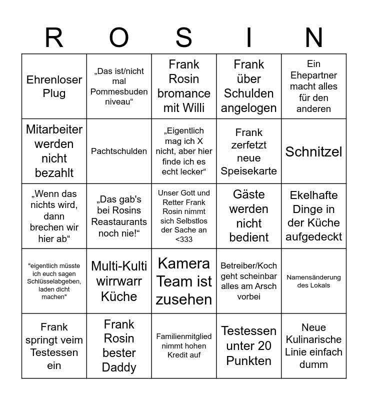 This bingo card has a free space and 32 words: Testessen unter 20 Punkten, Makeover Ikea style, „Das gab's bei Rosins Reastaurants noch nie!“, Mit Weißwein ablöschen, "eigentlich müsste ich euch sagen Schlüsselabgeben, laden dicht machen", Pachtschulden, Ein Ehepartner macht alles für den anderen, Namensänderung des Lokals, „Das ist/nicht mal Pommesbuden niveau“, Jemand fängt an zu weinen, „Eigentlich mag ich X nicht, aber hier finde ich es echt lecker“, Frank Rosin bromance mit Willi, Kein gelernter Koch anwesend, Frank liebt das Dessert, Gäste werden nicht bedient, Frank deckt Vorrat an convenience/TK Ware auf, Frank springt veim Testessen ein, „Wenn das nichts wird, dann brechen wir hier ab“, Kamera Team ist zusehen, Multi-Kulti wirrwarr Küche, Betreiber/Koch geht scheinbar alles am Arsch vorbei, Musik praktikant gönnt wildeste Mucke, Ekelhafte Dinge in der Küche aufgedeckt, Frank Rosin bester Daddy, Neue Kulinarische Linie einfach dumm, Frank über Schulden angelogen, Frank zerfetzt neue Speisekarte, Mitarbeiter werden nicht bezahlt, Ehrenloser Plug, Familienmitglied nimmt hohen Kredit auf, Frank beschwert sich über nicht vorhandendes Rezeptbuch and Schnitzel.