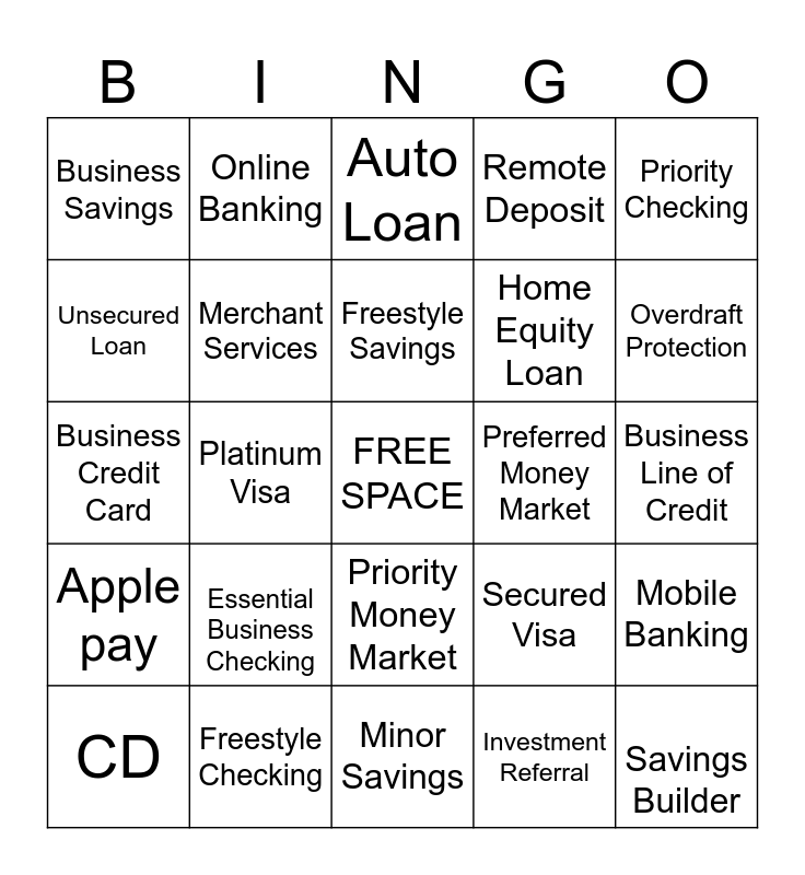 This bingo card has a free space and 24 words: Essential Business Checking, Freestyle Checking, Freestyle Savings, CD, Priority Checking, Business Savings, Unsecured Loan, Online Banking, Preferred Money Market, Priority Money Market, Home Equity Loan, Business Credit Card, Secured Visa, Mobile Banking, Merchant Services, Investment Referral, Business Line of Credit, Auto Loan, Overdraft Protection, Platinum Visa, Savings Builder, Apple pay, Remote Deposit and Minor Savings.