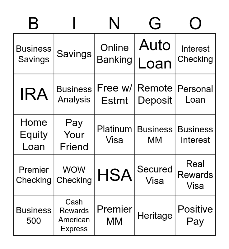 This bingo card has a free space and 24 words: Business 500, WOW Checking, Free w/ Estmt, Heritage, Interest Checking, Business Savings, Savings, Online Banking, Business MM, Business Interest, Home Equity Loan, Business Analysis, Secured Visa, Real Rewards Visa, IRA, Cash Rewards American Express, Premier MM, Auto Loan, Personal Loan, Premier Checking, Pay Your Friend, HSA, Remote Deposit and Positive Pay.