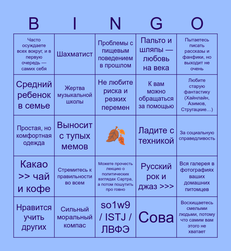 This bingo card has a free space and 24 words: Стремитесь к правильности во всем, Сильный моральный компас, Не любите риска и резких перемен, Нравится учить других, Пытаетесь писать рассказы и фанфики, но выходит не очень, Часто осуждаете всех вокруг, и в первую очередь — самих себя, Средний ребенок в семье, Шахматист, Ладите с техникой, Можете прочесть лекцию о политических взглядах Сартра, а потом пошутить про говно, К вам можно обращаться за помощью, Простая, но комфортная одежда, Русский рок и джаз >>>, Вся галерея в фотографиях ваших домашних питомцев, Жертва музыкальной школы, Сова, За социальную справедливость, Проблемы с пищевым поведением в прошлом, Любите старую фантастику (Хайнлайн, Азимов, Стругацкие…), Выносит с тупых мемов, Восхищаетесь смелыми людьми, потому что самим вам этого не хватает, Какао >> чай и кофе, Пальто и шляпы — любовь на века and so1w9 / ISTJ / ЛВФЭ.