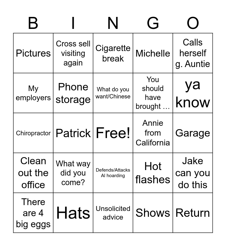 This bingo card has a free space and 24 words: What way did you come?, Hats, What do you want/Chinese, There are 4 big eggs, Calls herself g. Auntie, Pictures, My employers, Cross sell visiting again, Annie from California, Defends/Attacks Al hoarding, You should have brought …, Chiropractor, Hot flashes, Jake can you do this, Phone storage, Shows, Garage, Cigarette break, ya know, Patrick, Return, Clean out the office, Michelle and Unsolicited advice.
