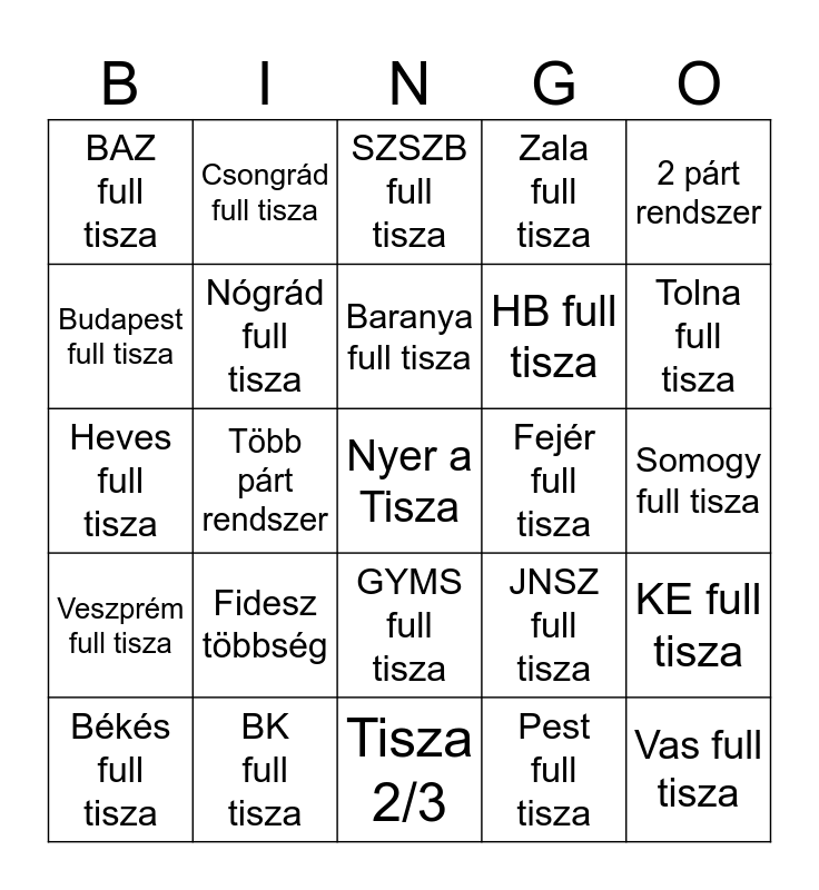 This bingo card has a free space and 24 words: Fidesz többség, BK full tisza, Baranya full tisza, Békés full tisza, 2 párt rendszer, BAZ full tisza, Budapest full tisza, Csongrád full tisza, Fejér full tisza, GYMS full tisza, HB full tisza, Heves full tisza, JNSZ full tisza, KE full tisza, Nógrád full tisza, Pest full tisza, Somogy full tisza, SZSZB full tisza, Tolna full tisza, Több párt rendszer, Vas full tisza, Veszprém full tisza, Zala full tisza and Tisza 2/3.