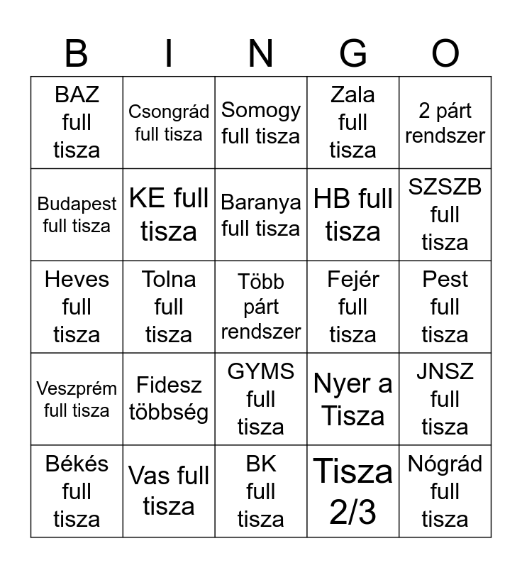 This bingo card has 25 words: Fidesz többség, BK full tisza, Baranya full tisza, Békés full tisza, 2 párt rendszer, BAZ full tisza, Budapest full tisza, Csongrád full tisza, Fejér full tisza, GYMS full tisza, HB full tisza, Heves full tisza, Nyer a Tisza, JNSZ full tisza, KE full tisza, Nógrád full tisza, Pest full tisza, Somogy full tisza, SZSZB full tisza, Tolna full tisza, Több párt rendszer, Vas full tisza, Veszprém full tisza, Zala full tisza and Tisza 2/3.
