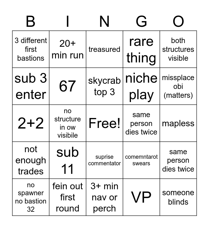 This bingo card has a free space and 24 words: sub 11, fein out first round, skycrab top 3, no spawner no bastion 32, both structures visible, 3 different first bastions, sub 3 enter, 20+ min run, same person dies twice, suprise commentator, niche play, 2+2, comemntarot swears, same person dies twice, 67, VP, mapless, treasured, missplace obi (matters), no structure in ow visibile, someone blinds, not enough trades, rare thing and 3+ min nav or perch.