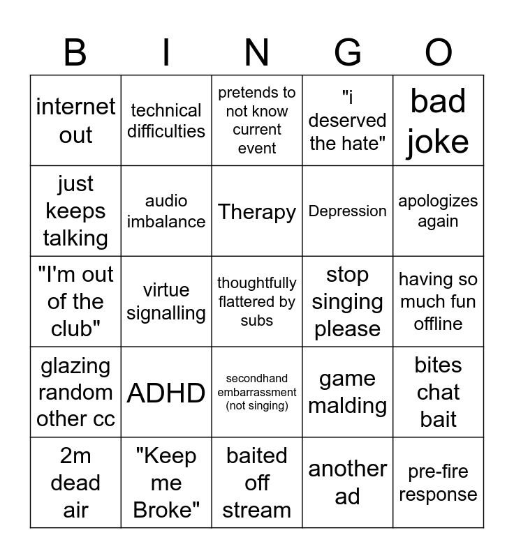 This bingo card has a free space and 24 words: ADHD, "Keep me Broke", Therapy, 2m dead air, bad joke, internet out, just keeps talking, technical difficulties, stop singing please, secondhand embarrassment (not singing), Depression, "I'm out of the club", game malding, bites chat bait, audio imbalance, another ad, having so much fun offline, pretends to not know current event, apologizes again, virtue signalling, pre-fire response, glazing random other cc, "i deserved the hate" and baited off stream.