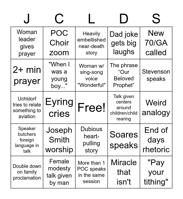 This bingo card has a free space and 31 words: More than 1 POC speaks in the same session, "Israel", Eyring cries, Motherhood is a woman’s highest calling/other sexist dogma, Woman leader gives prayer, Heavily embellished near-death story, "When I was a young boy...", Soares speaks, Talk given centers around children/child rearing, Miracle that isn't, Weird analogy, "Pay your tithing", "Even", Mid sentence lip smack, Stevenson speaks, Blatant transphobia, End of days rhetoric, Joseph Smith worship, Speaker butchers foreign language in talk, Dubious heart-pulling story, New 70/GA called, Bad mental health advice (Just Pray), Double down on family proclamation, POC Choir zoom, The phrase “Our Beloved Prophet”, 2+ min prayer, Dad joke gets big laughs, Uchtdorf tries to relate something to aviation, Female modesty talk given by man, Woman w/ sing-song voice "Wonderful" and Talking about LGBT+ without saying LGBT+.