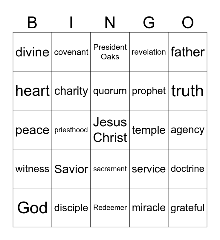 This bingo card has a free space and 24 words: God, Savior, quorum, miracle, father, divine, covenant, President Oaks, temple, agency, peace, charity, service, doctrine, heart, disciple, Redeemer, revelation, truth, witness, priesthood, sacrament, prophet and grateful.