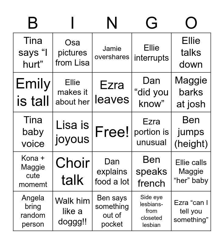 This bingo card has a free space and 24 words: Angela bring random person, Choir talk, Ezra leaves, Side eye lesbians- from closeted lesbian, Ellie talks down, Tina says “I hurt”, Osa pictures from Lisa, Jamie overshares, Ezra portion is unusual, Ben jumps (height), Tina baby voice, Ellie makes it about her, Ben speaks french, Ellie calls Maggie “her” baby, Emily is tall, Walk him like a doggg!!, Ben says something out of pocket, Ellie interrupts, Maggie barks at josh, Kona + Maggie cute momemt, Lisa is joyous, Dan explains food a lot, Dan “did you know” and Ezra “can I tell you something”.