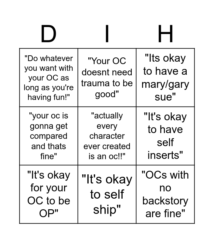 This bingo card has a free space and 8 words: "It's okay to have self inserts", "Its okay to have a mary/gary sue", "Your OC doesnt need trauma to be good", "It's okay for your OC to be OP", "Do whatever you want with your OC as long as you're having fun!", "OCs with no backstory are fine", "your oc is gonna get compared and thats fine" and "It's okay to self ship".
